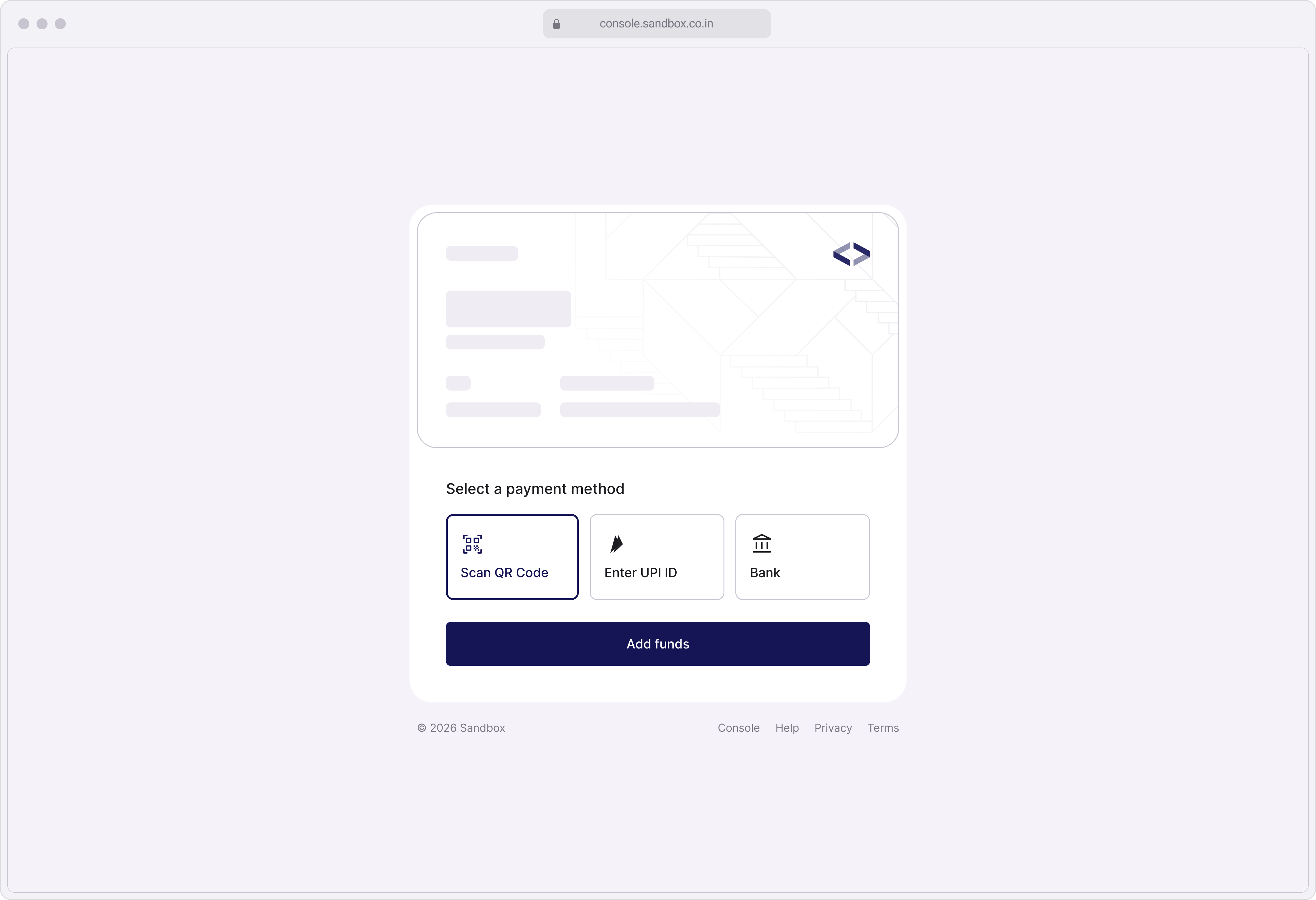 You can easily add money to your Sandbox Wallet via bank transfer (IMPS/NEFT/RTGS). Follow these steps to view the bank account details where you can transfer the funds. Steps Go to Wallet Log in to Console. From the top-right header, click on the ...